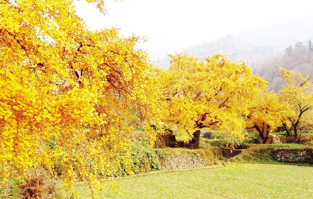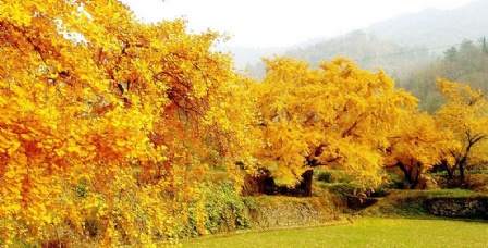 "五棵树”是银杏谷著名的景点,五棵银杏像兄弟般在这里迎风斗雨聚集了千年,仍然枝繁叶茂、高大挺拔。在秋日的阳光下,满树泛着金黄色光芒的银杏叶或迎风摇曳,或随风洒落,像一只只自由自在、翩翩起舞的金色蝴蝶,充满了春天般的生机和秋天的成熟,这种和谐之美浪漫而温馨。